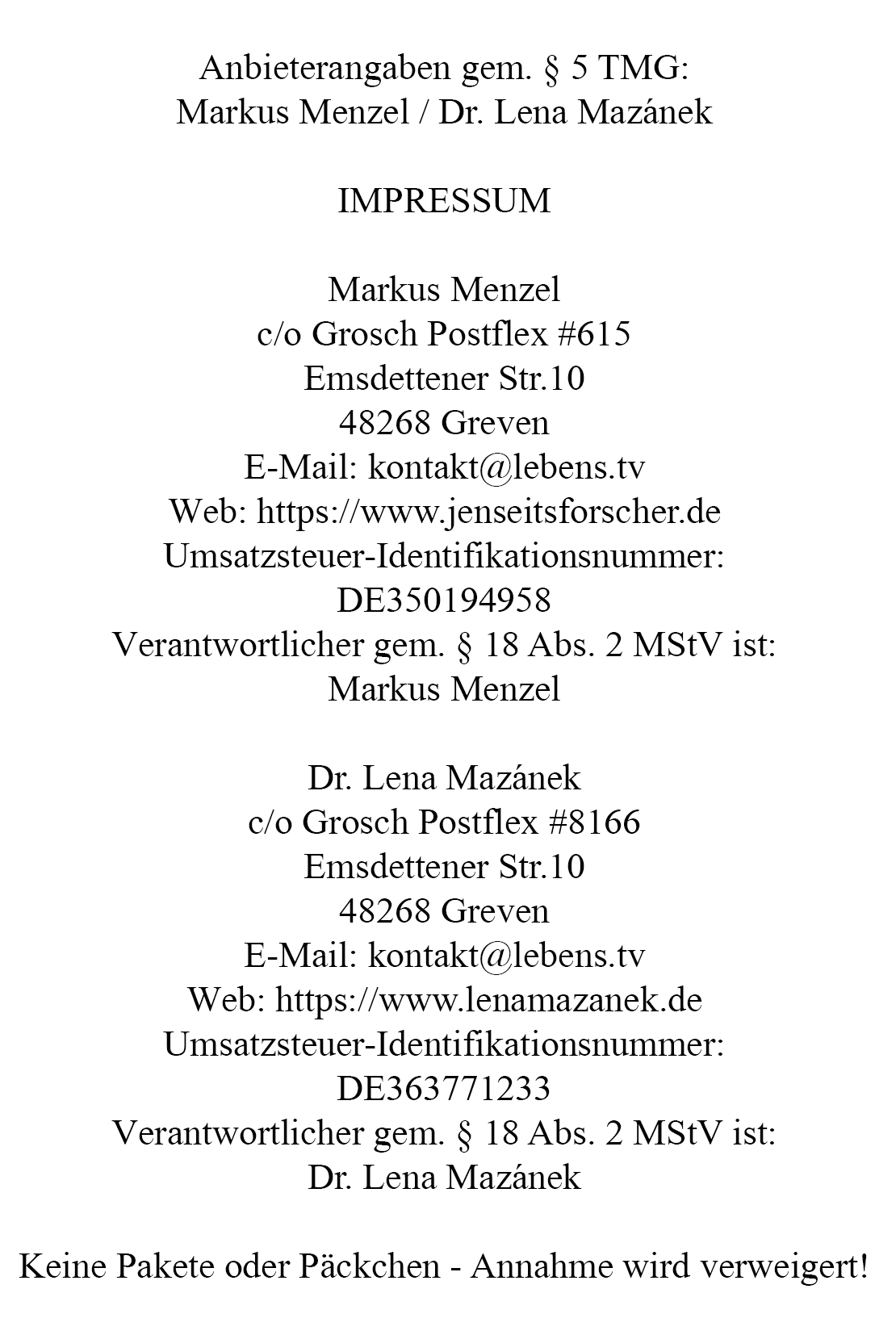 ist Dr. Lena Mazánek, c/o Grosch Postflex #8166, Emsdettener Str. 10, 48268 Greven, Umsatzsteuer-Identifikationsnummer: DE363771233